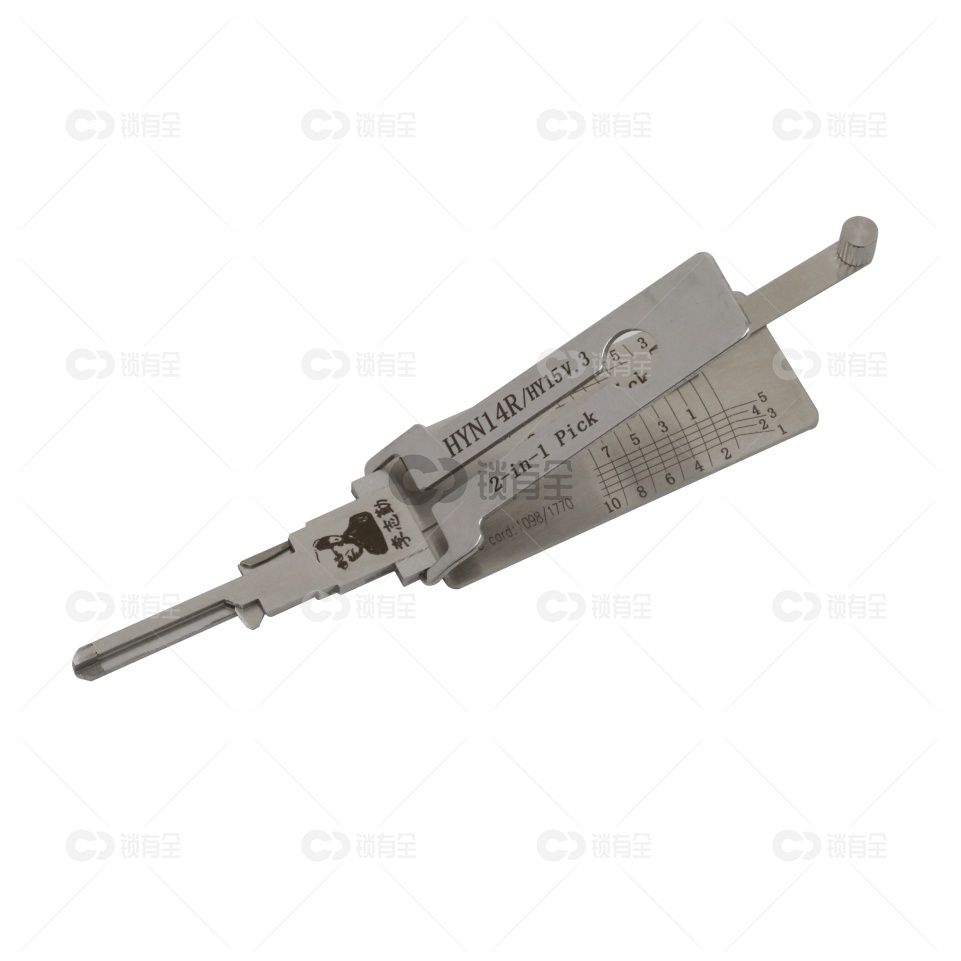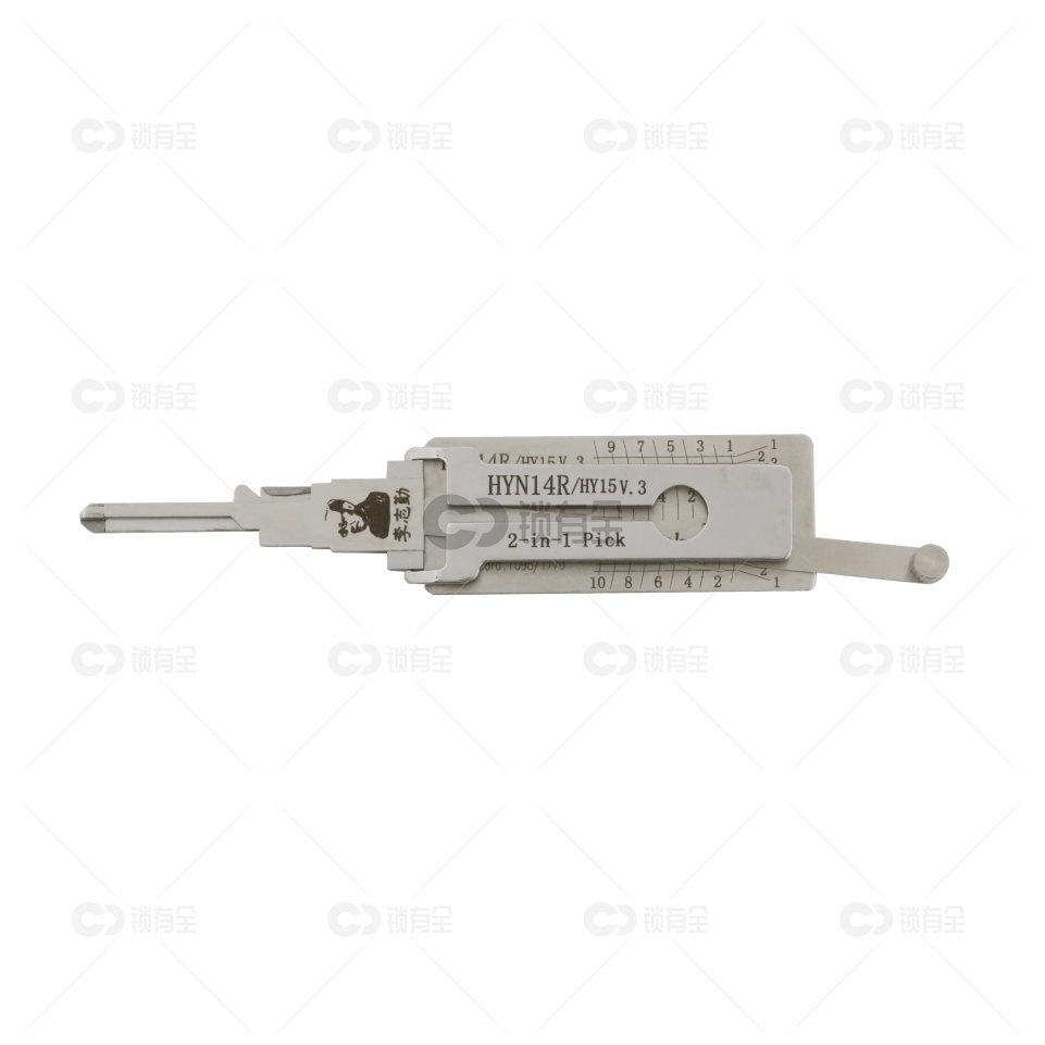 李氏HYN14R/HY15V.3读开二合一,适用于现代新款(左)的车锁开启与暗配,这款工具有很多种叫法,有李氏读开二合一、开启阅读、连读代开二合一工具,从字面上理解,它就是定位开和读齿器功能合并后的最新式锁匠用品。HY15读齿开启二合一可精确定位技术性开启现代新款(左) 的汽车锁,不须拆解锁芯,不需开启,并可阅读出全部齿号,读出齿号后即可使用李氏剪齿钳剪配出钥匙(读出数据直接做出钥匙),可按模版给客户配出原装钥匙,不伤锁片,方便快捷,操作简单,全不锈钢精制,经久耐用,是高级锁匠的必备用品