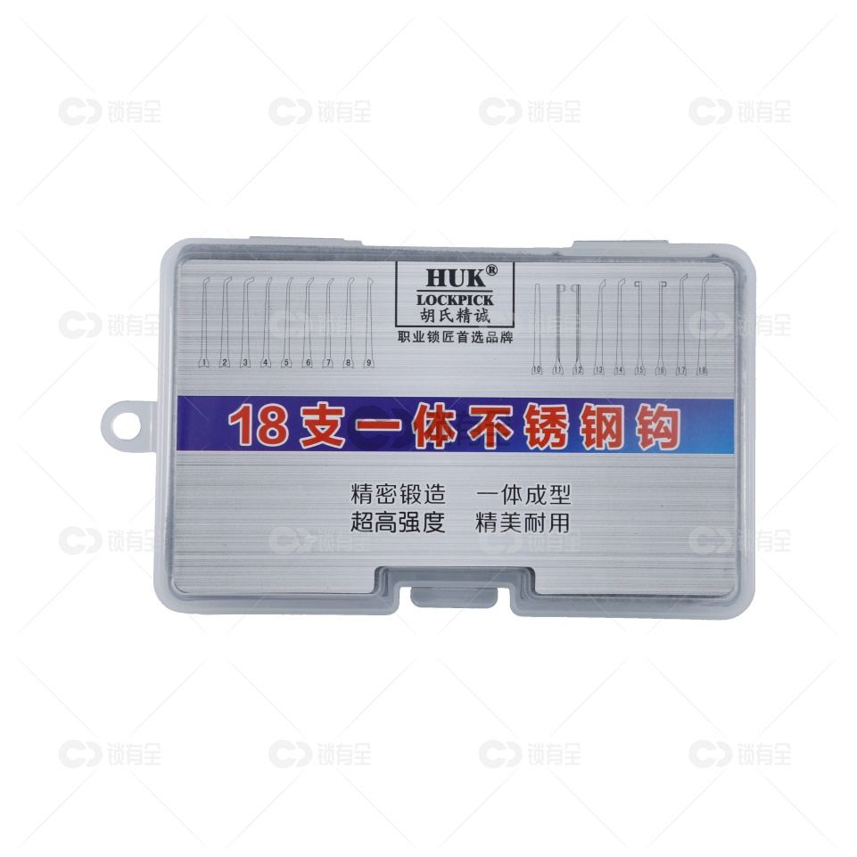 「特别申明」职业锁匠工具下单需要提供锁匠相关证明核实无误方可发货。 HUK胡氏精诚最新研发制作的18支单钩百合匙包,选择进口德国不锈钢制作,韧性和强度远远优于同类产品。手把防滑浮雕花纹。皮包包装,使得整体工具的工艺上达到同类产品最优秀,工具本身的质量、外观、实用性、价格,都将满足锁匠朋友们的需求。以前的各类单钩套装包,在材质选料方面不到位,产品整体工艺落后欧美数十年,而且弯钩数据基本仿制国外现有成品,数据误差相对比较大,而18支单钩百合匙包以超值的性价比,必将受到锁匠朋友们的好评。