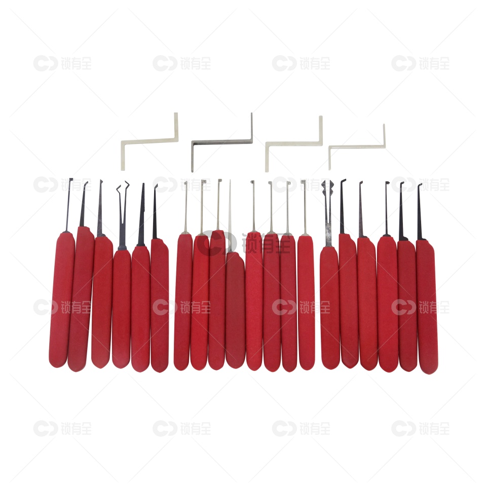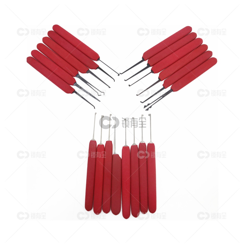 精品20支单钩单钩王,这次出品的红色装单钩包,选材全进口德国高强度工具钢条研磨制作,表层碳黑防锈处理。手把选用原生料树胶套裹。皮包包装,使得整体工具达到前所未有的高度,红色防滑抹杀手柄,手感极好,颜色鲜艳时尚,精品16支单钩单钩王该产品被称为命名为“中国锁匠 单钩王”。