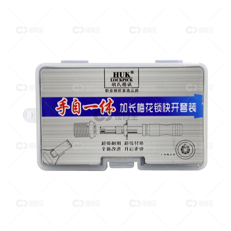 HUK最新出品的七星梅花三件装工具采用航空铝制不锈钢材质为手柄, 轻盈中不乏坚固; 顶针热处理后韧性与刚性求得更好的平衡! 使用上面较为传统的梅花工具要方便实用很多; 首先套管加长, 针对目前保险柜应急锁加深的问题得到非常好的处理, 阻尼橡胶圈的使用也加大了开启的方便。 后面带有磁性的环形归零圈,设计上有了很大的创新, 再也不必为这个圈圈晃来荡去而烦恼了   工具盒中也配备的一些备用的阻尼橡胶圈和几支顶针以便不时之需。 这款梅花工具 实惠的价格,精美的做工, 一定为锁友们大大的做贡献。。