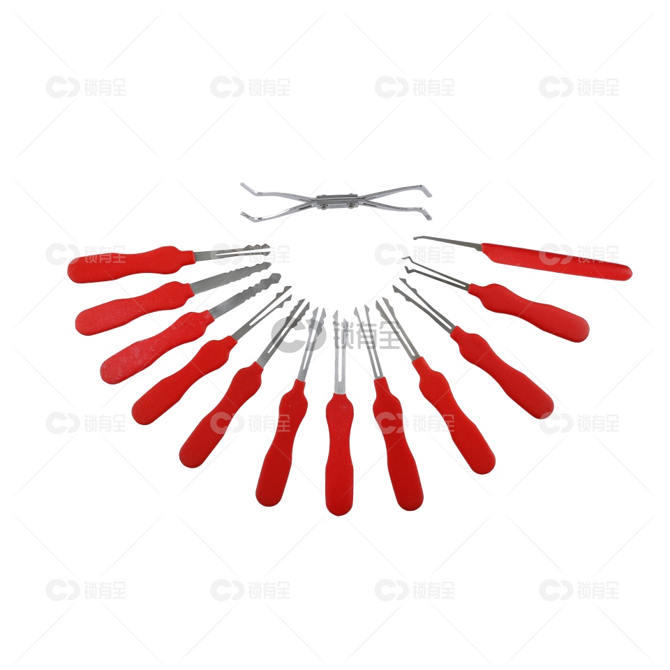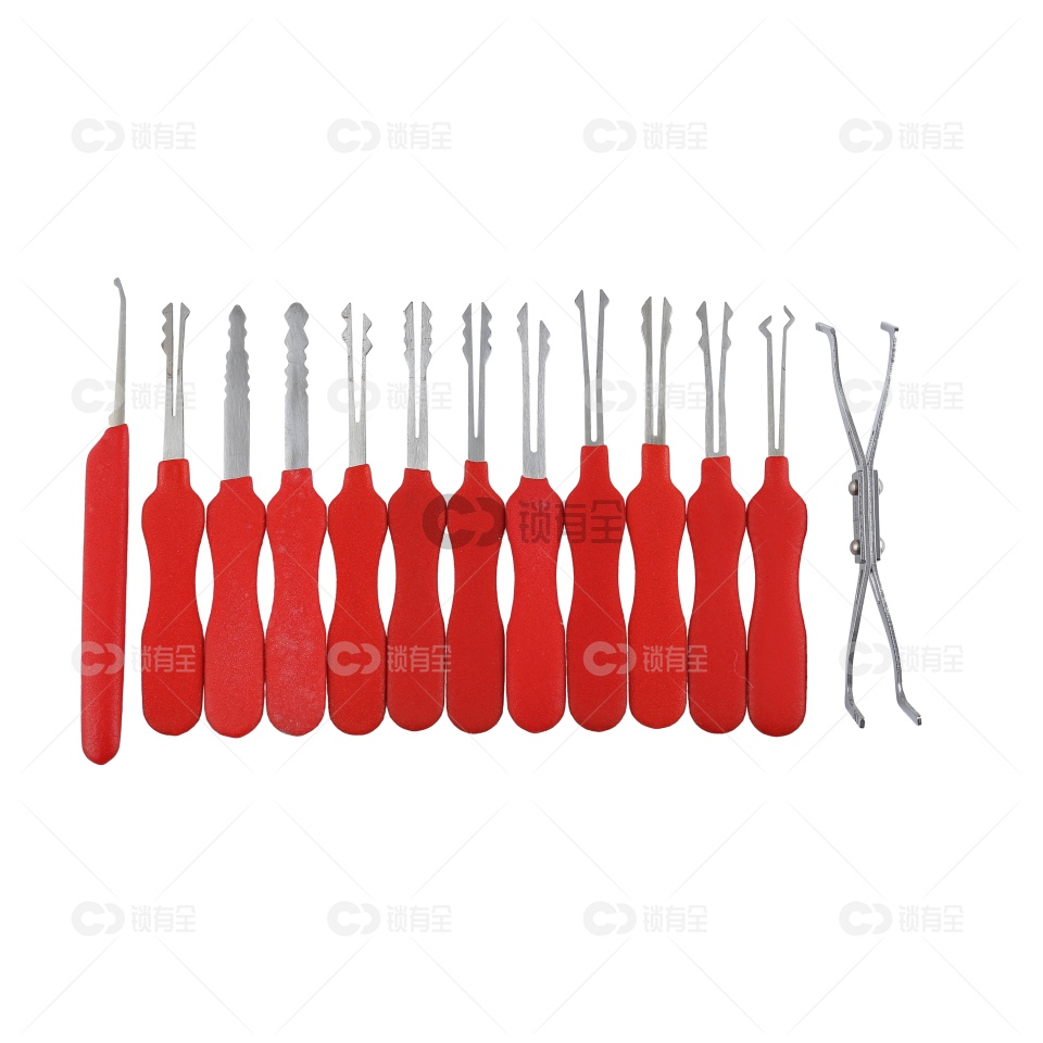 新款不锈钢剪刀汽车快手13件套,磨砂防滑手柄,产品采用进口高强度不锈钢制作,弹性好,不容易生锈,开启率高,非一般电镀品能比的。快速开启两面牙花的汽车锁的好工具。