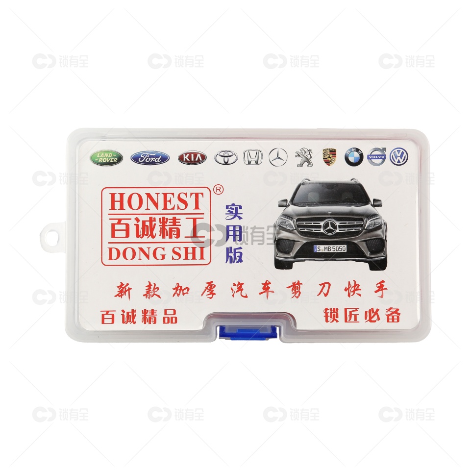 新款不锈钢剪刀汽车快手12件套,磨砂防滑手柄,产品采用进口高强度不锈钢制作,弹性好,不容易生锈,开启率高,非一般电镀品能比的。快速开启两面牙花的汽车锁的好工具。