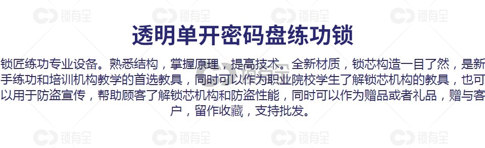 锁匠练功专业设备。熟悉结构,掌握原理,提高技术。全新材质,锁芯构造一目了然,是新手练功和培训机构教学的首选教具,同时可以作为职业院校学生了解锁芯机构的教具,也可以用于防盗宣传,帮助顾客了解锁芯机构和防盗性能,同时可以作为赠品或者礼品,赠与客户,留作收藏,支持批发。