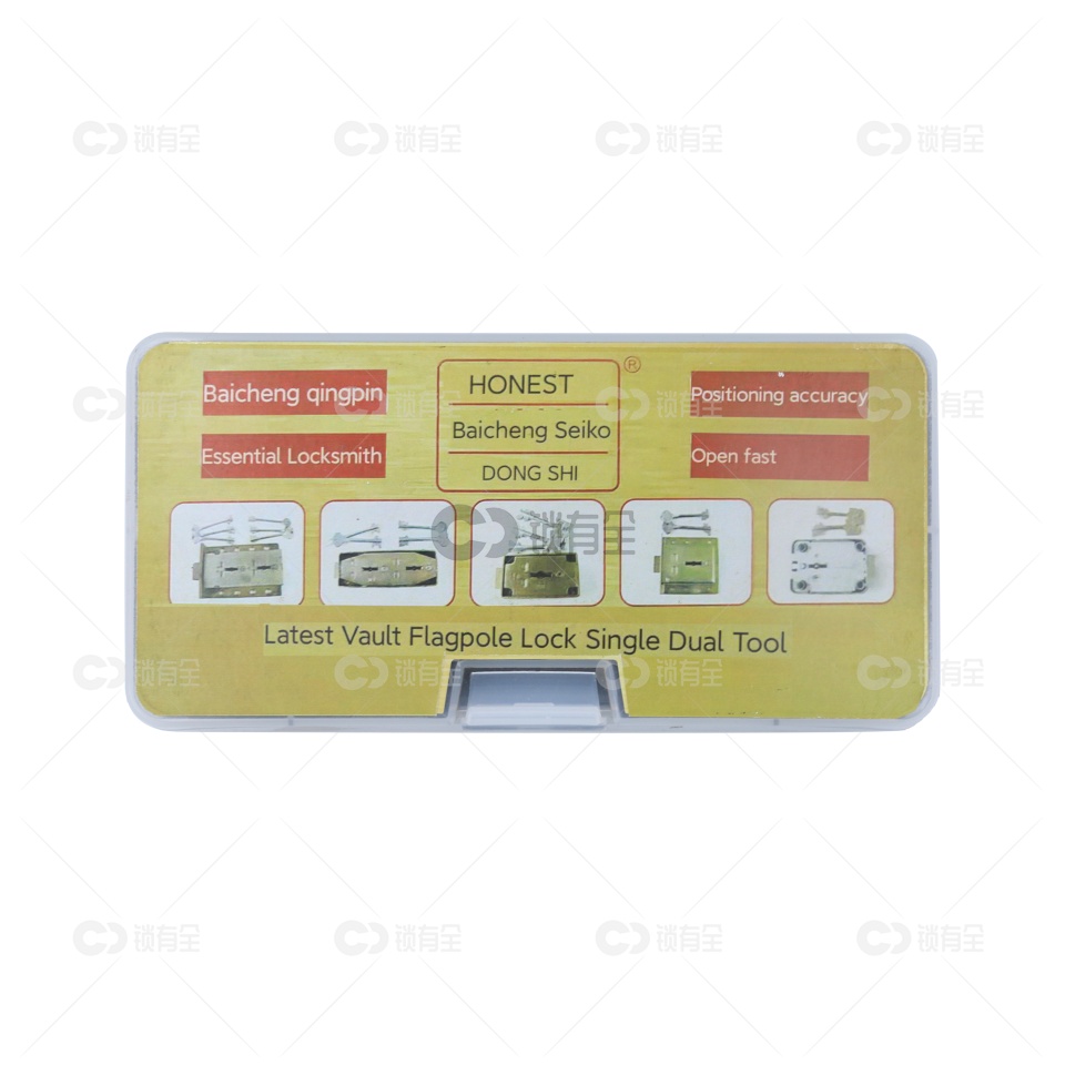 本产品是百诚推出的金库锁双联叶片锁旗杆锁工具。此种型号专用于,使用方法是将两根带动杆安装在工具上,别子装长带动杆,拨子装短带动杆。然后插入锁芯别子带动锁芯转动的同时用拨子拨动叶片,此时注意别子不同于一般民用锁的别子,在使用时力量可以稍微大一些,让拨子的感觉更明显。