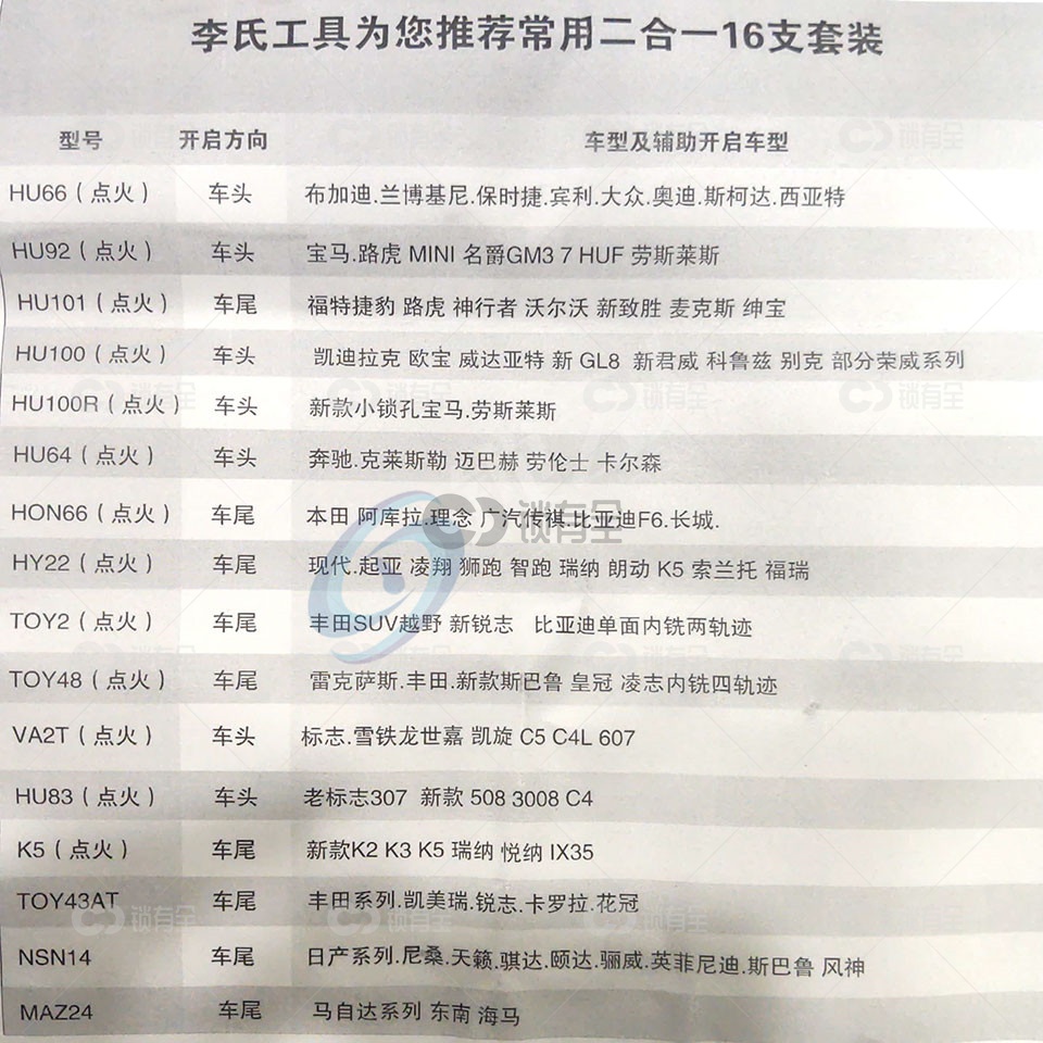 李氏16件套读开二合一,适用于常用车型车锁的开启与暗配。