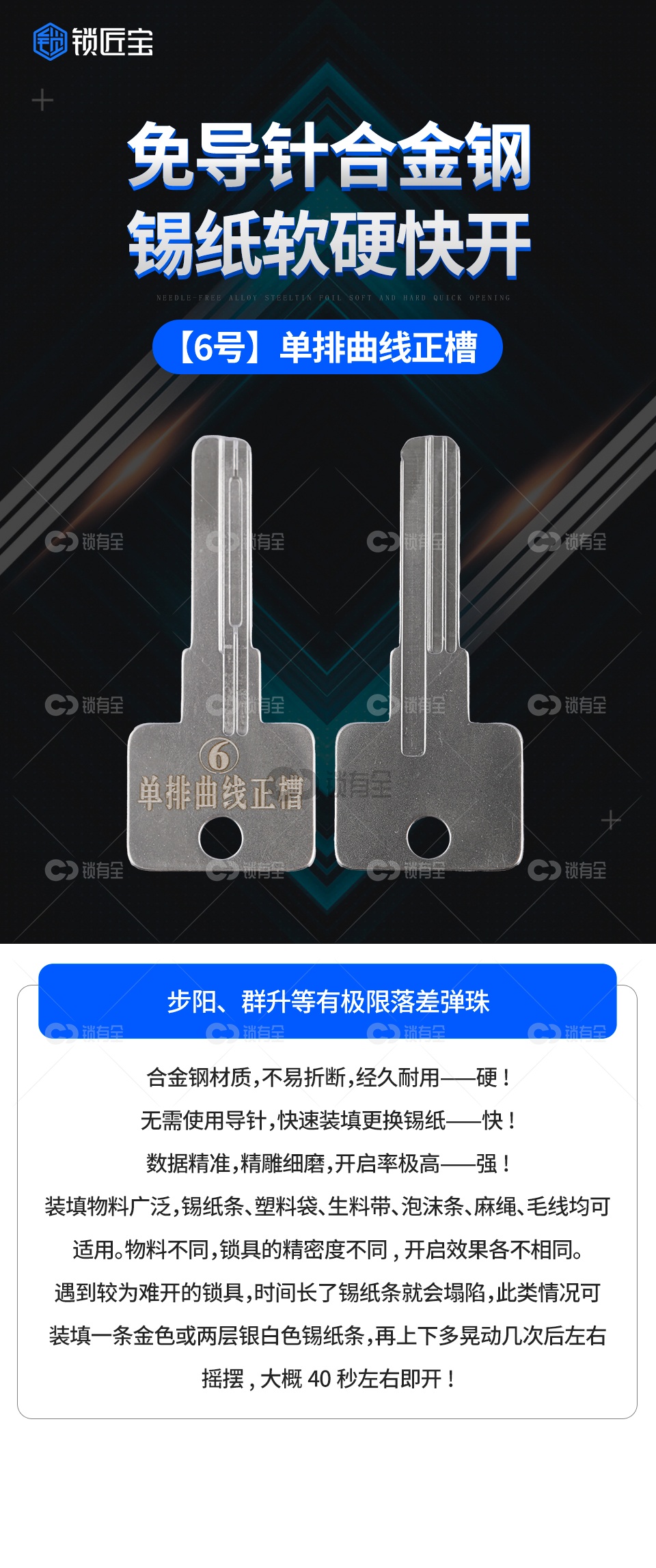 「特别申明」职业锁匠工具下单需要提供锁匠相关证明核实无误方可发货。步阳、群升等有极限落差弹珠 不锈钢材质,不易折断,经久耐用。硬! 无需使用导针,快速装填更换锡纸。快! 数据精准,精雕细磨,开启率极高。强!