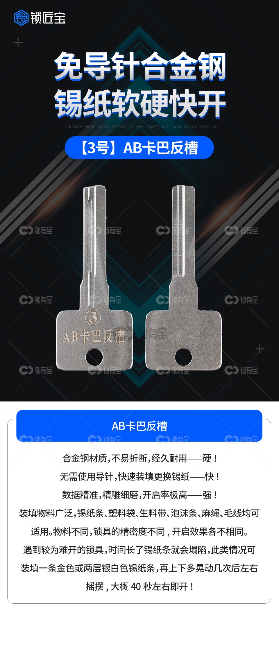 「特别申明」职业锁匠工具下单需要提供锁匠相关证明核实无误方可发货。AB卡巴反槽 不锈钢材质,不易折断,经久耐用。硬!