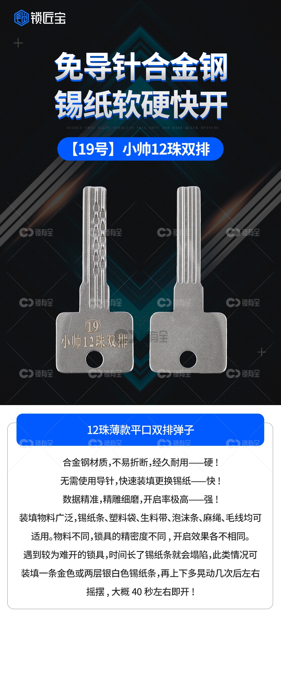 「特别申明」职业锁匠工具下单需要提供锁匠相关证明核实无误方可发货。12珠薄款平口双排弹子,定位开开启率百分之99.9