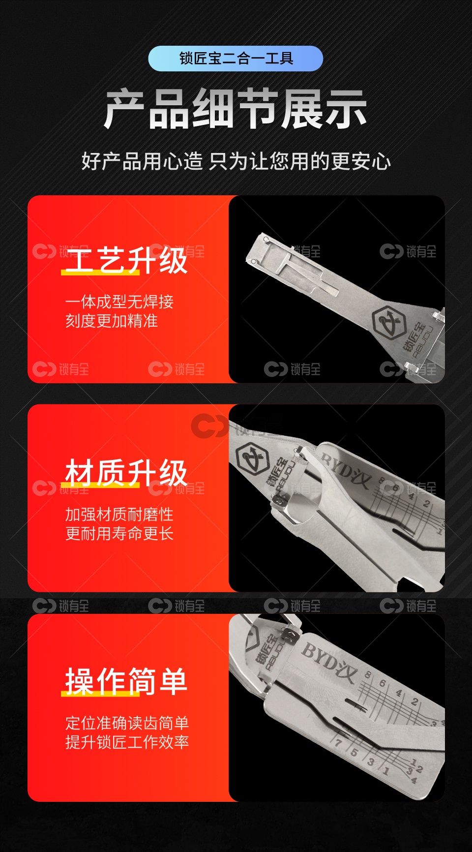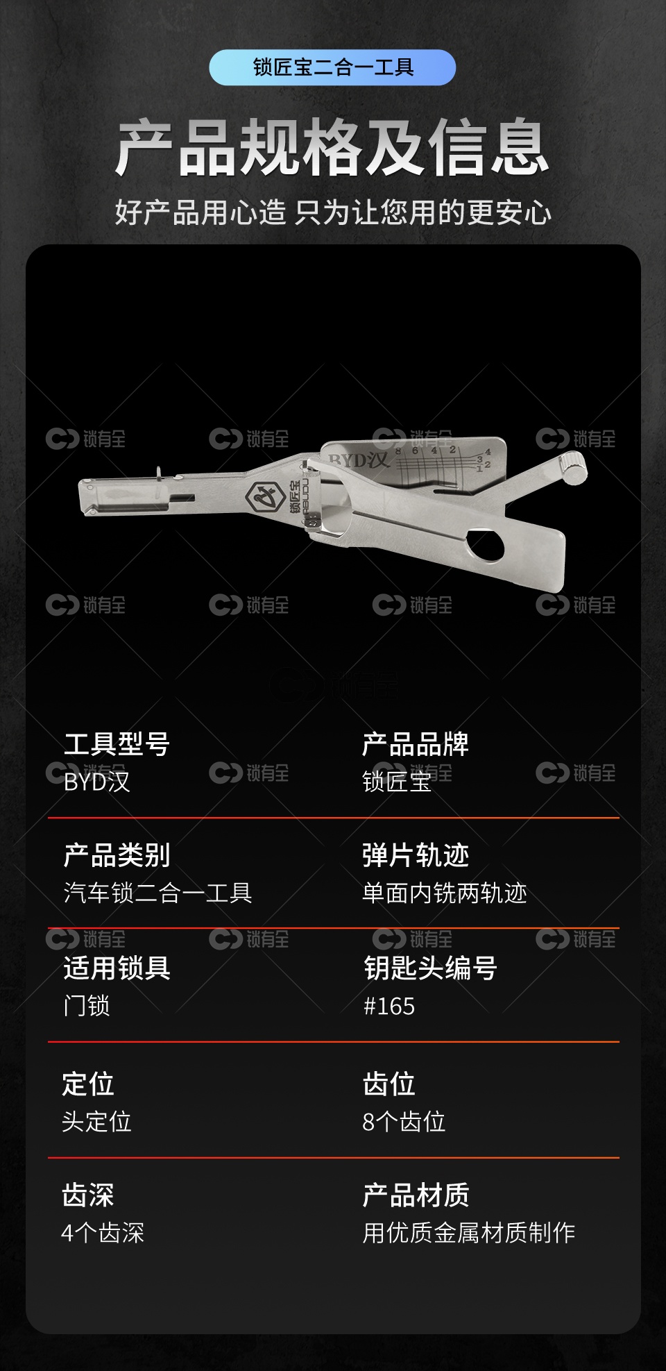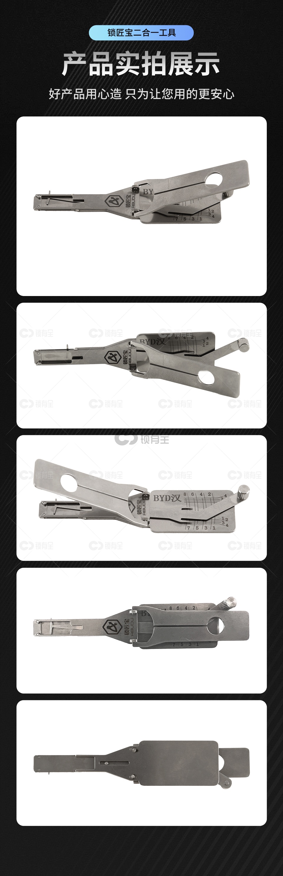 本款锁匠宝二合一工具专为比亚迪汉设计,同时兼容2018款丰田RAV4荣放及其他BYD车型。工具特别针对隐藏式把手车型设计,通过超短主面板与弯杆结构,有效避免在操作过程中顶碰到车体,从而解决开不了锁的问题。制造精良,易于操作,为锁匠提供一种更快捷、更安全的开启选择。无论是日常工作还是应急开启,这款工具都将是您不可或缺的助手。