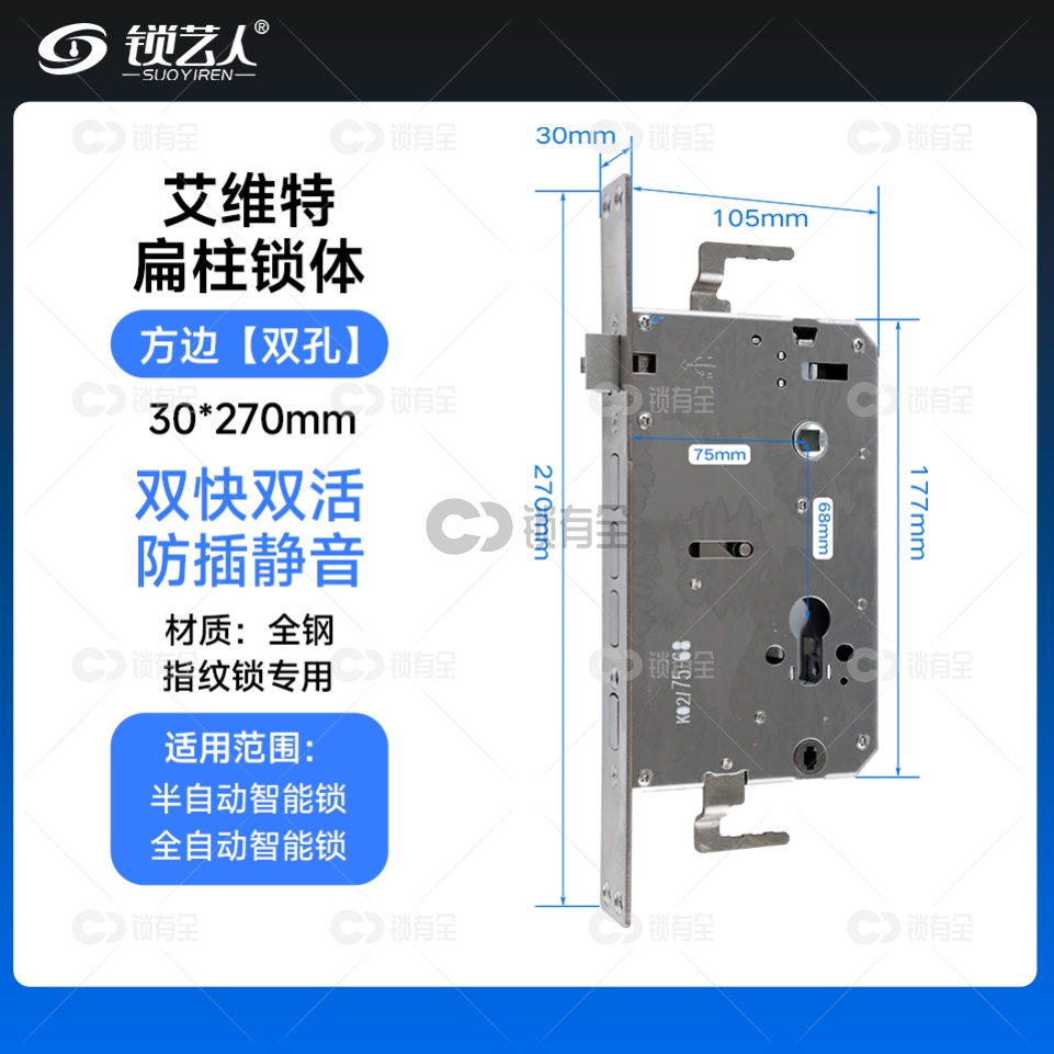 艾维特锁体小-30*270 专用指纹锁密码锁电子锁 锁体 全304不锈钢 双快双活 防插静音 镜面精钢系列